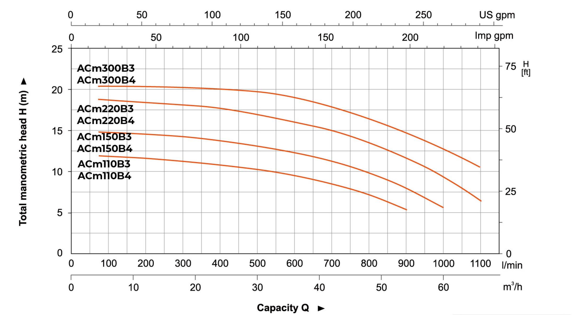 Ниже представлен график производительности для моделей AC(m) 110-300B3-4 с отображением зависимости между подачей (л/мин) и напором (м):